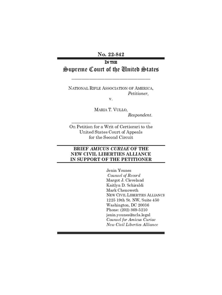 No. 22842 IN THESupreme Court of the United States ___NATIONAL RIFLE ASSOCIATION OF AMERICA, Petitioner, v. MARIA T. VULLO,Respondent.___On Petition for a Writ of Certiorari to the United States Court