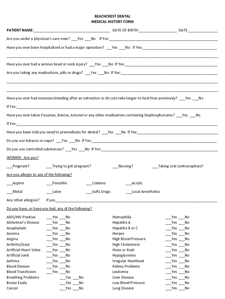 BEACHCREST DENTAL MEDICAL HISTORY FORM PATIENT NAME:___ DATE OF BIRTH:___ DATE___ Are you under a physicians care now? ___Yes ___No If Yes:___ Have you ever been hospitalized or had a major operation?