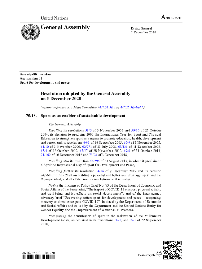 A/RES/75/18United NationsGeneral AssemblyDistr.: General 7 December 2020Seventyfifth session Agenda item 11 Sport for development and peaceResolution adopted by the General Assembly on 1 December