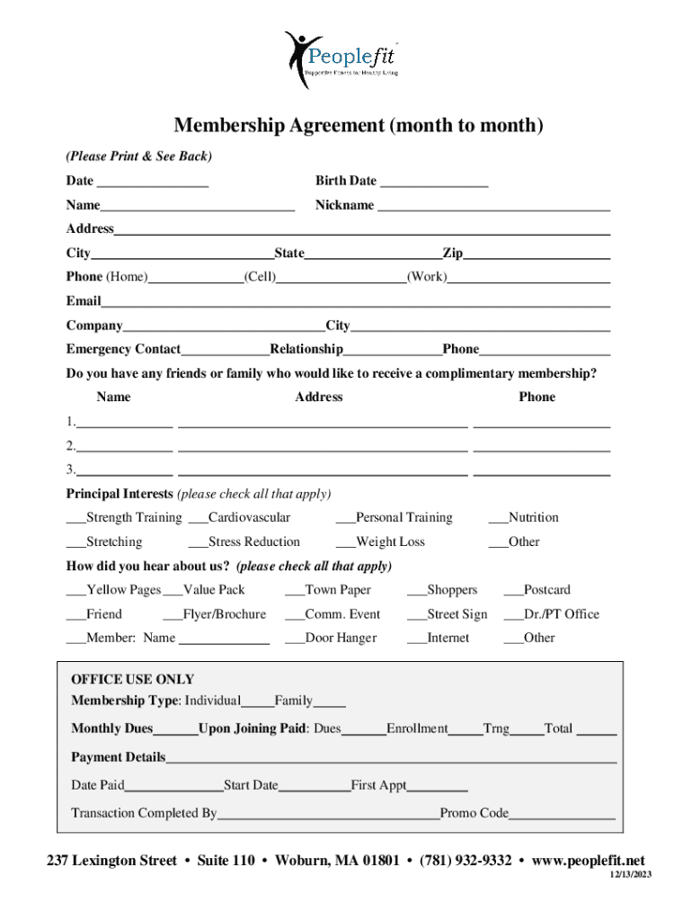 Membership Agreement (month to month) (Please Print & See Back) DateBirth DateNameNicknameAddress CityStatePhone (Home)Zip(Cell)(Work)Email CompanyCityEmergency ContactRelationshipPhoneDo you have