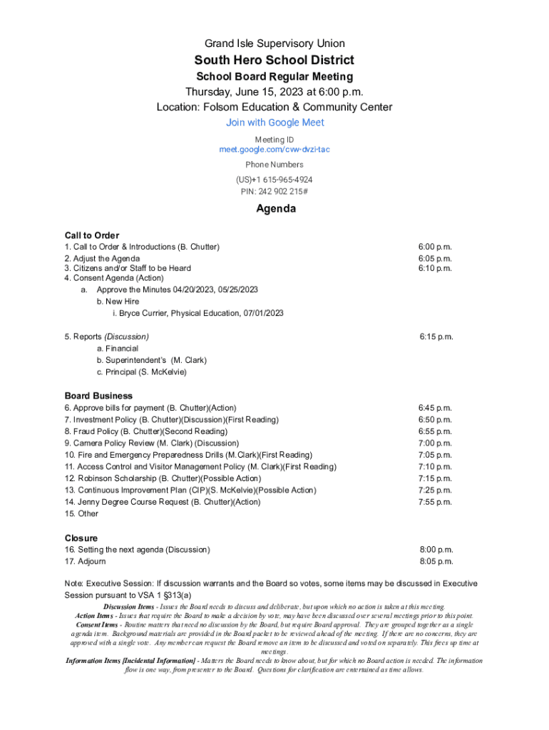 Grand Isle Supervisory UnionSouth Hero School District School Board Regular Meeting Thursday, June 15, 2023 at 6:00 p.m. Location: Folsom Education & Community Center Join with Google Meet Meeting