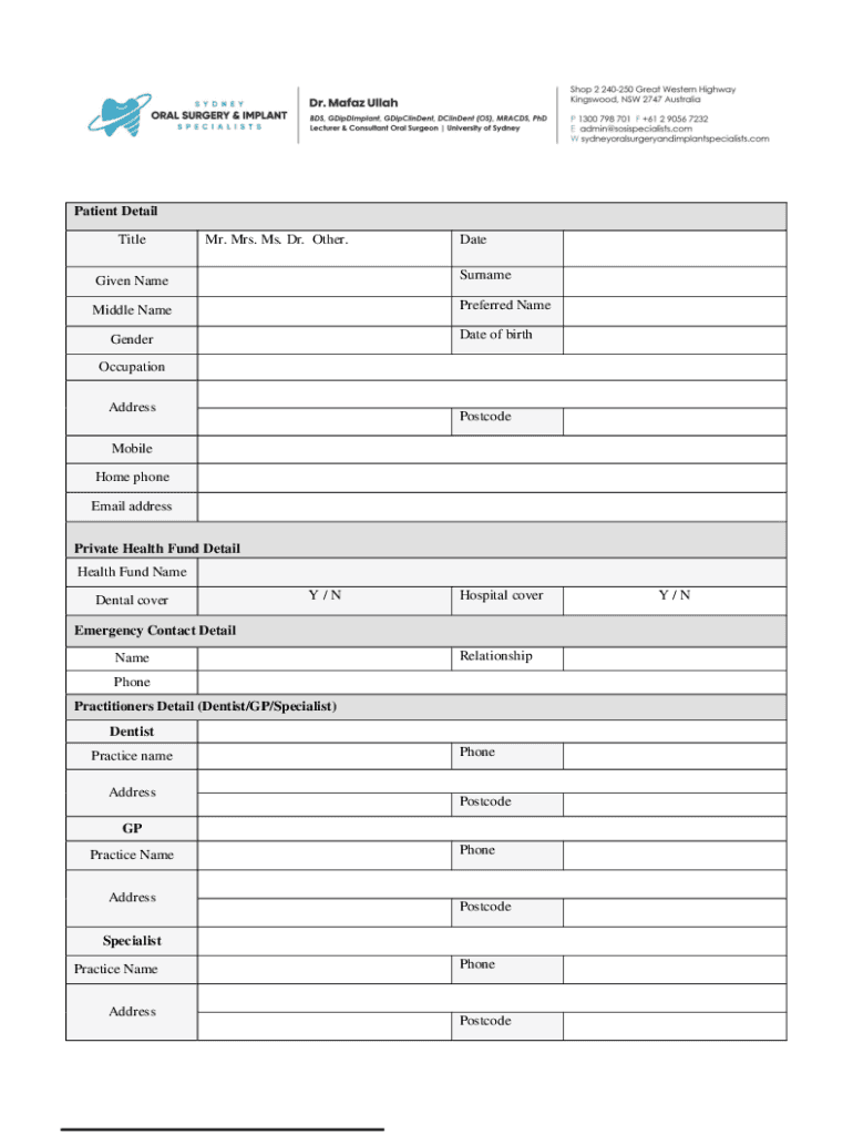 Patient Detail TitleMr. Mrs. Ms. Dr. Other.DateGiven NameSurnameMiddle NamePreferred Name Date of birthGender Occupation AddressPostcodeMobile Home phone Email address Private Health Fund Detail Health