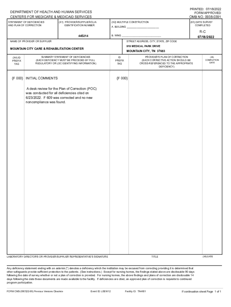 PRINTED: 07/18/2022 FORM APPROVEDDEPARTMENT OF HEALTH AND HUMAN SERVICES CENTERS FOR MEDICARE & MEDICAID SERVICES STATEMENT OF DEFICIENCIES AND PLAN OF CORRECTION(X1) PROVIDER/SUPPLIER/CLIA IDENTIFICATION