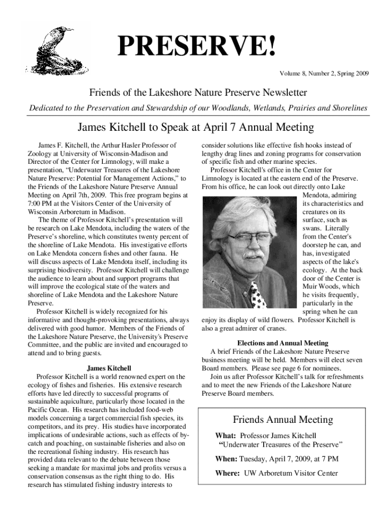 PRESERVE! Volume 8, Number 2, Spring 2009Friends of the Lakeshore Nature Preserve Newsletter Dedicated to the Preservation and Stewardship of our Woodlands, Wetlands, Prairies and ShorelinesJames