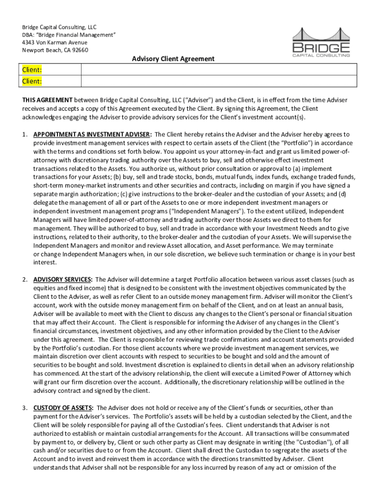 Bridge Capital Consulting, LLC DBA: Bridge Financial Management 4343 Von Karman Avenue Newport Beach, CA 92660Advisory Client Agreement Client: Client: THIS AGREEMENT between Bridge Capital Consulting,