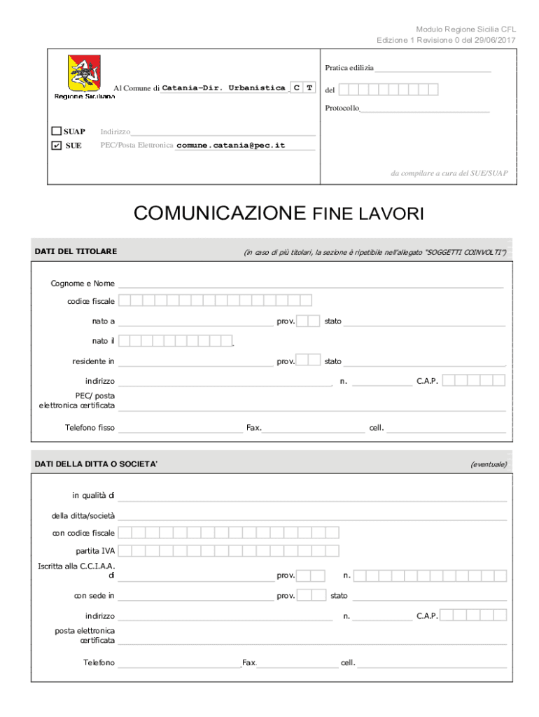 Modulo Regione Sicilia CFL Edizione 1 Revisione 0 del 29/06/2017Pratica edilizia ___CataniaDir. Urbanistica C T Al Comune di ___del|__|__|__|__|__|__|__|__|Protocollo___SUAPIndirizzo___SUEcomune.catania@pec.it