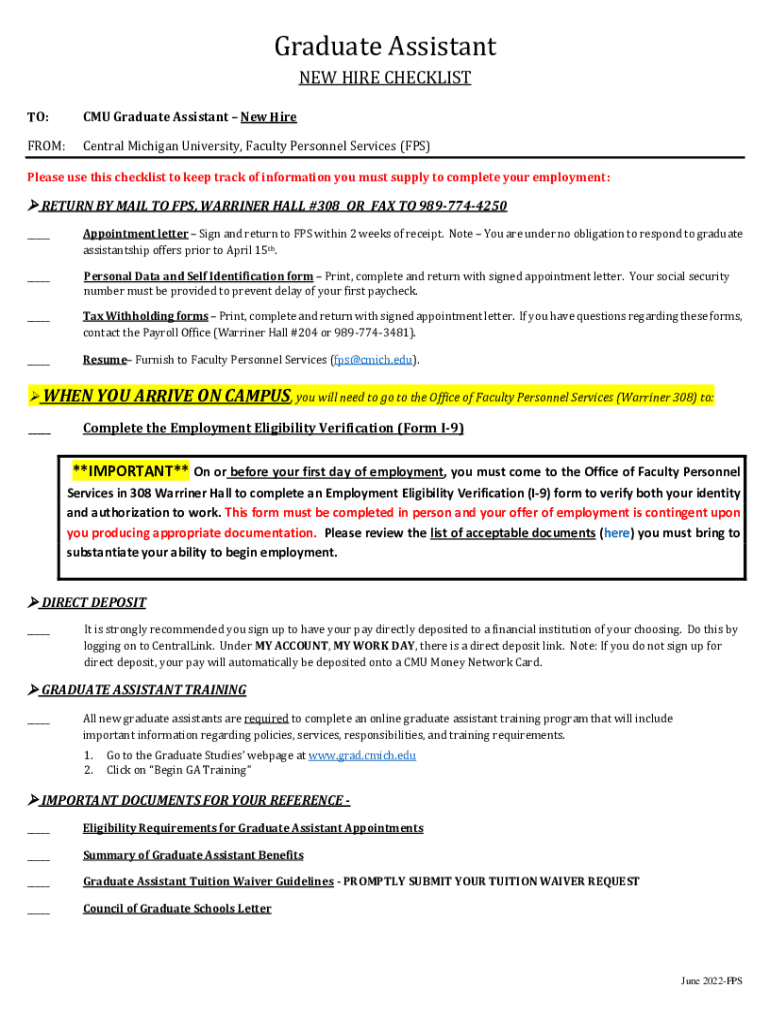 Graduate Assistant NEW HIRE CHECKLIST TO:CMU Graduate Assistant New HireFROM:Central Michigan University, Faculty Personnel Services (FPS)Please use this checklist to keep track of information you