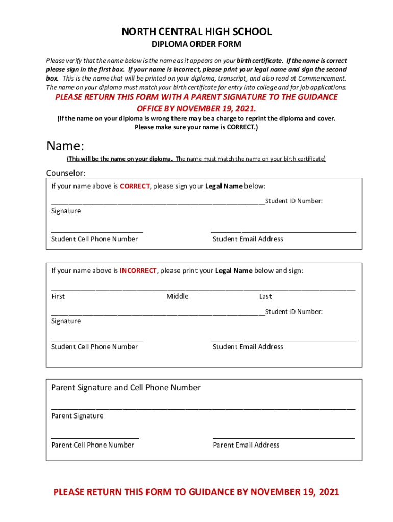 NORTH CENTRAL HIGH SCHOOL DIPLOMA ORDER FORM Please verify that the name below is the name as it appears on your birth certificate. If the name is correct please sign in the first box. If your name