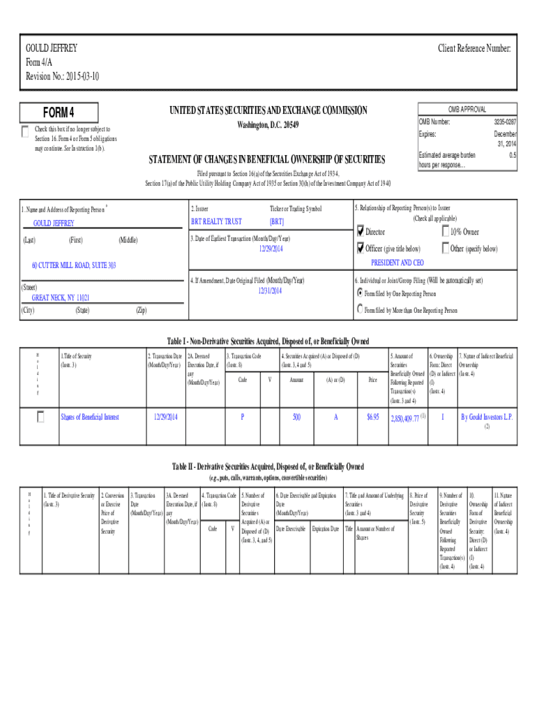 GOULD JEFFREY Form 4/A Revision No.: 20150310Client Reference Number:UNITED STATES SECURITIES AND EXCHANGE COMMISSIONFORM 4OMB APPROVAL OMB Number: Expires:Washington, D.C. 20549Check this box if