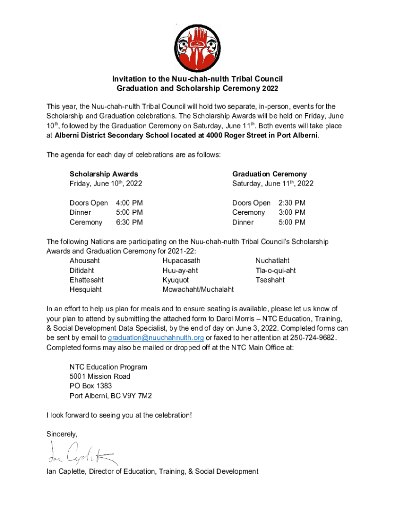 Invitation to the Nuuchahnulth Tribal Council Graduation and Scholarship Ceremony 2022 This year, the Nuuchahnulth Tribal Council will hold two separate, inperson, events for the Scholarship and Graduation