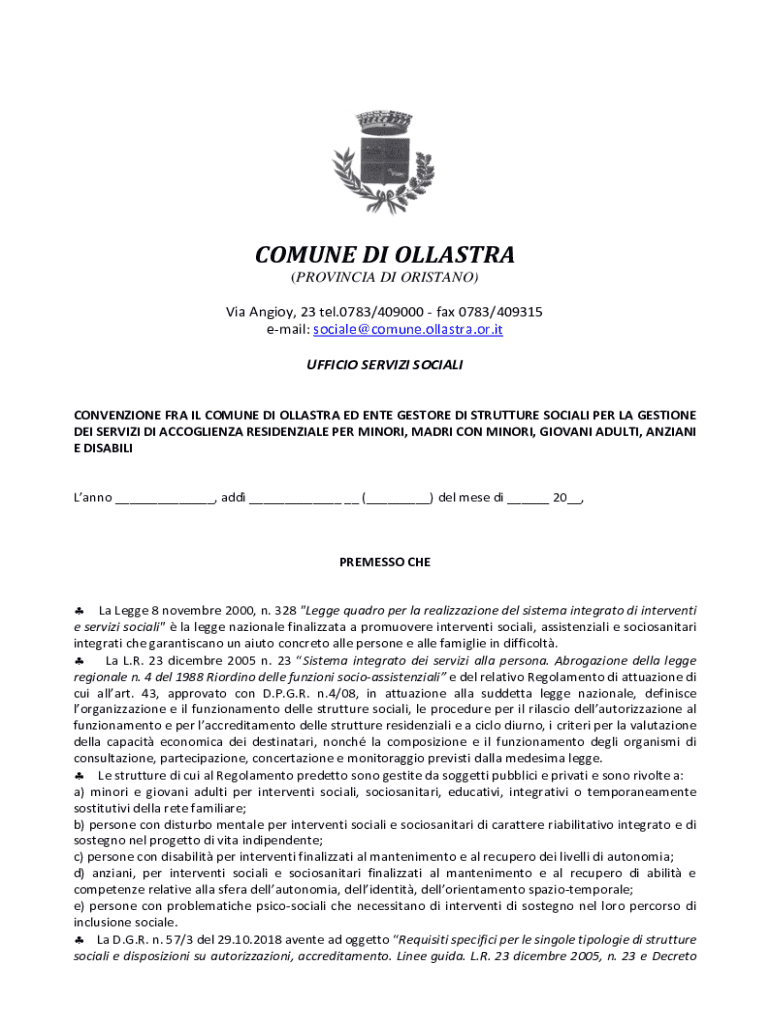 COMUNE DI OLLASTRA (PROVINCIA DI ORISTANO) Via Angioy, 23 tel.0783/409000 fax 0783/409315 email: sociale@comune.ollastra.or.it UFFICIO SERVIZI SOCIALI CONVENZIONE FRA IL COMUNE DI OLLASTRA ED ENTE