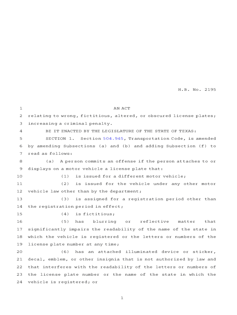 H.B.ANo.A21951AN ACT2relating to wrong, fictitious, altered, or obscured license plates;3increasing a criminal penalty.4BE IT ENACTED BY THE LEGISLATURE OF THE STATE OF TEXAS:5SECTIONA1.AASection