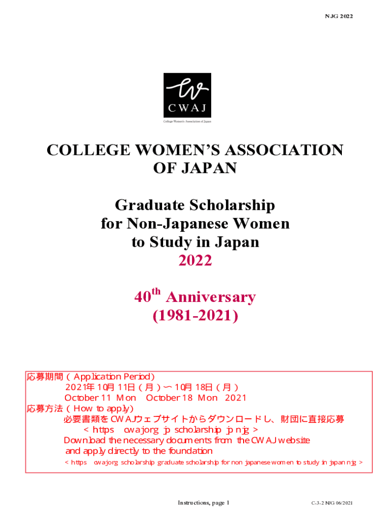 NJG 2022COLLEGE WOMENS ASSOCIATION OF JAPAN Graduate Scholarship for NonJapanese Women to Study in Japan 2022 40th Anniversary (19812021)Instructions, page 1C32 NJG 06/2021NJG 2022APPLICATION FORMS