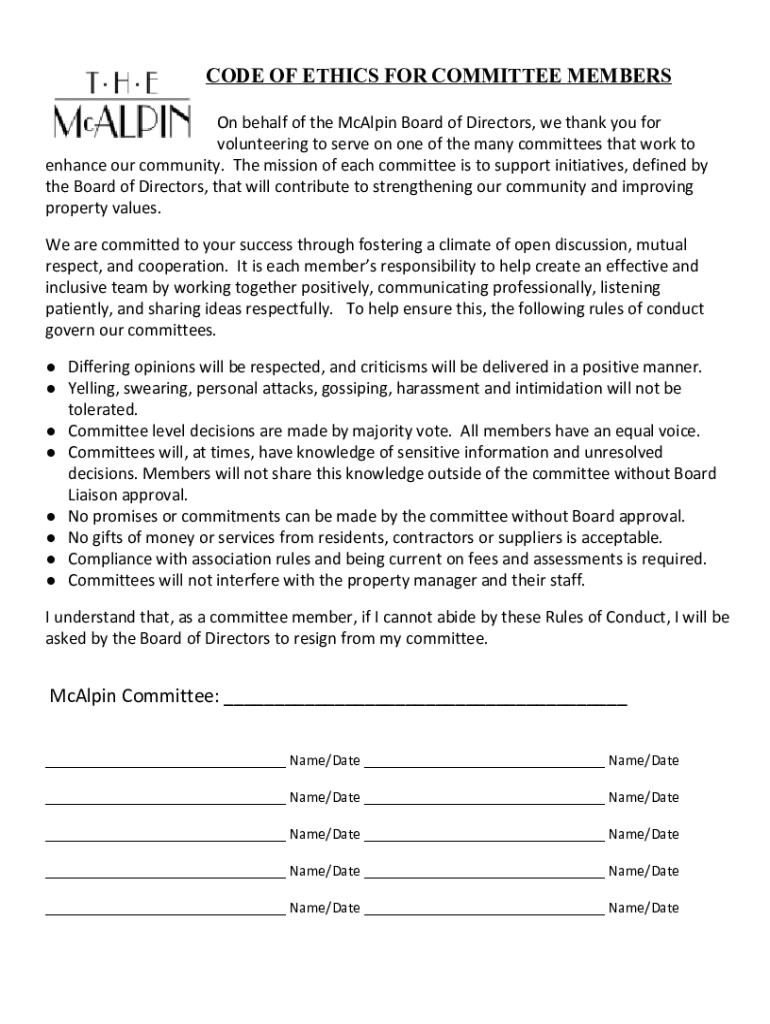 CODE OF ETHICS FOR COMMITTEE MEMBERS On behalf of the McAlpin Board of Directors, we thank you for volunteering to serve on one of the many committees that work to enhance our community. The mission