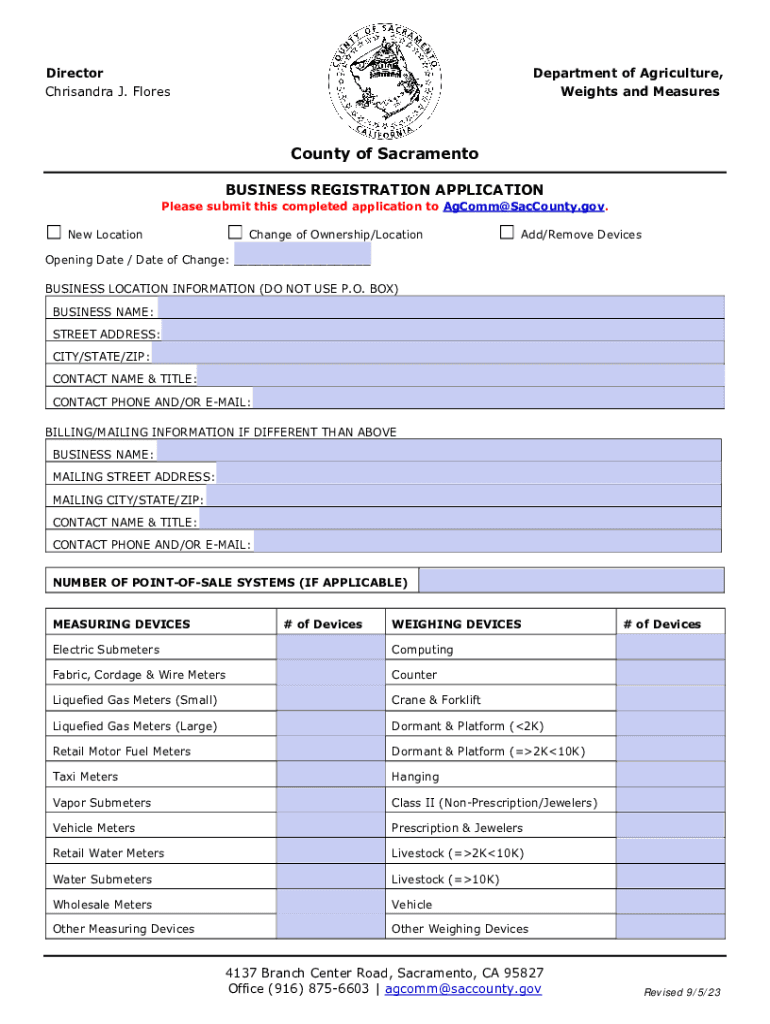 Director Chrisandra J. FloresDepartment of Agriculture, Weights and MeasuresCounty of Sacramento BUSINESS REGISTRATION APPLICATION Please submit this completed application to AgComm@SacCounty.gov.