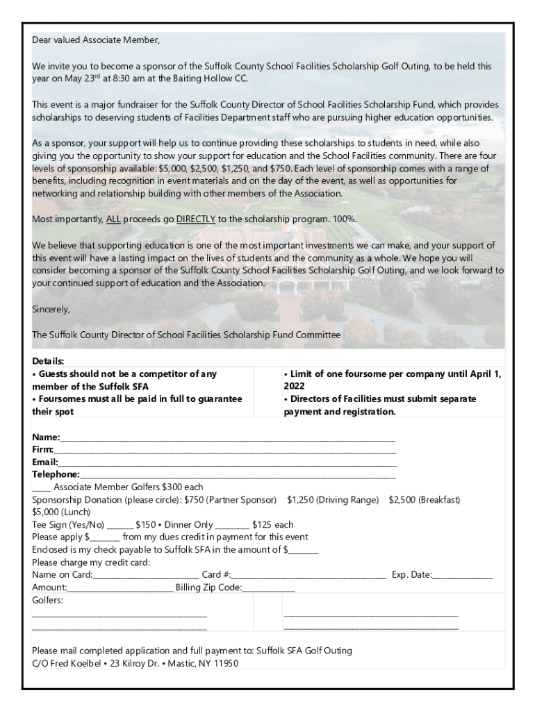 Dear valued Associate Member, We invite you to become a sponsor of the Suffolk County School Facilities Scholarship Golf Outing, to be held this year on May 23rd at 8:30 am at the Baiting Hollow CC.
