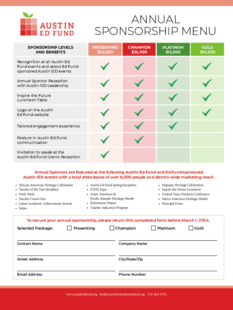 ANNUAL SPONSORSHIP MENU SPONSORSHIP LEVELS AND BENEFITSPRESENTING $50,000CHAMPION $25,000PLATINUM $15,000GOLD $10,000Recognition at all Austin Ed Fund events and select Ed Fundsponsored Austin ISD