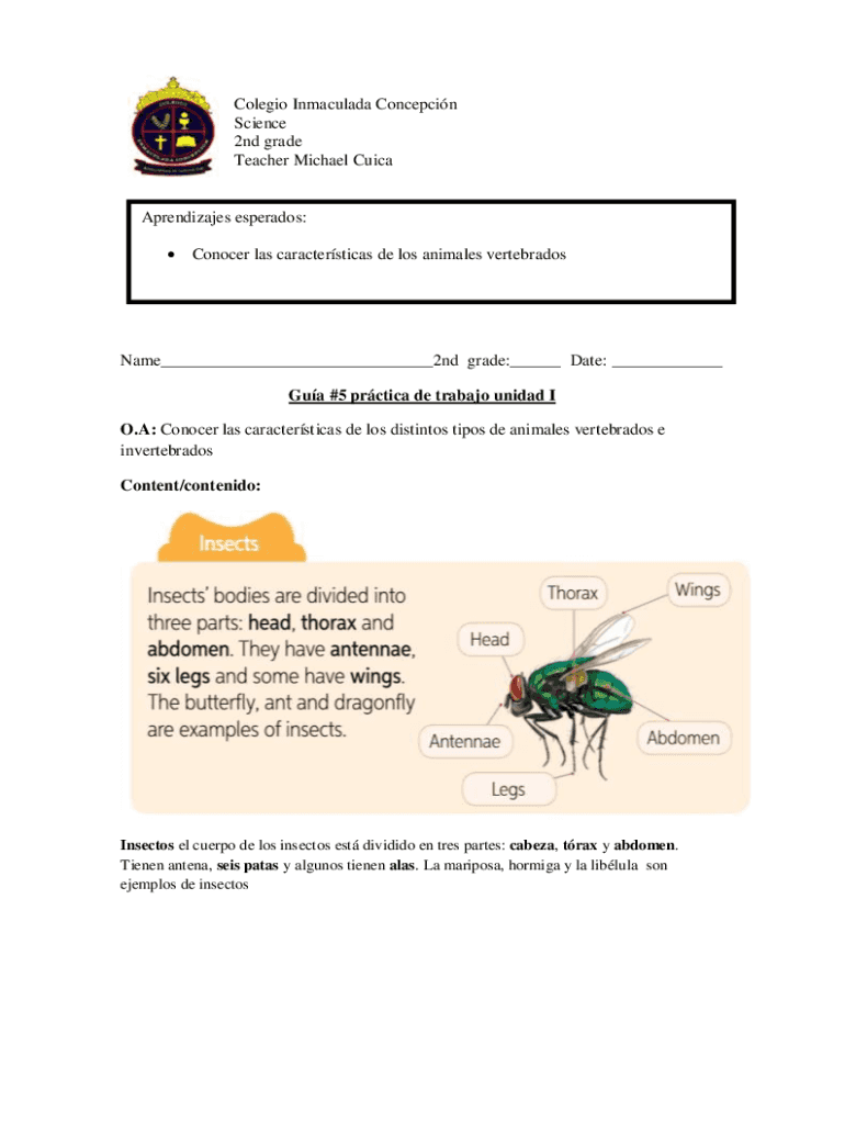 Colegio Inmaculada Concepcin Science 2nd grade Teacher Michael CuicaAprendizajes esperados: Conocer las caractersticas de los animales vertebradosName___2nd grade:___ Date: ___ Gua #5 prctica de trabajo