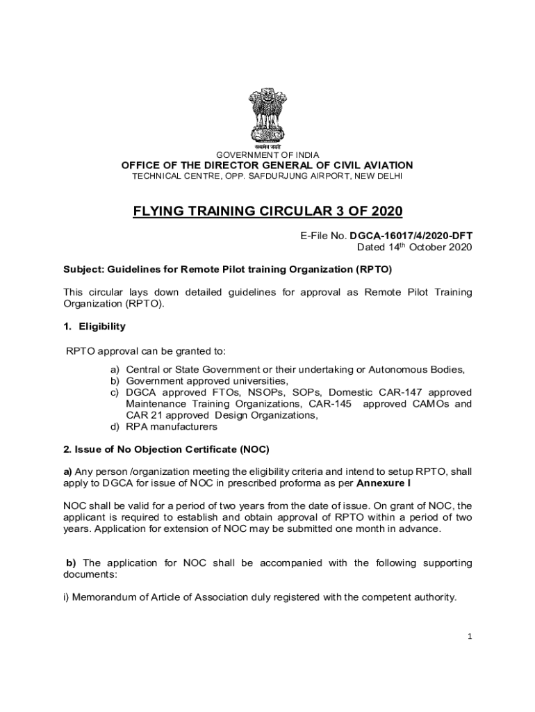 GOVERNMENT OF INDIAOFFICE OF THE DIRECTOR GENERAL OF CIVIL AVIATION TECHNICAL CENTRE, OPP. SAFDURJUNG AIRPORT, NEW DELHIFLYING TRAINING CIRCULAR 3 OF 2020 EFile No. DGCA16017/4/2020DFT Dated 14th