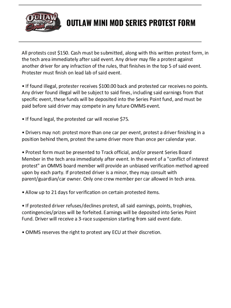 OUTLAW MINI MOD SERIES PROTEST Formal protests cost $150. Cash must be submitted, along with this written protest form, in