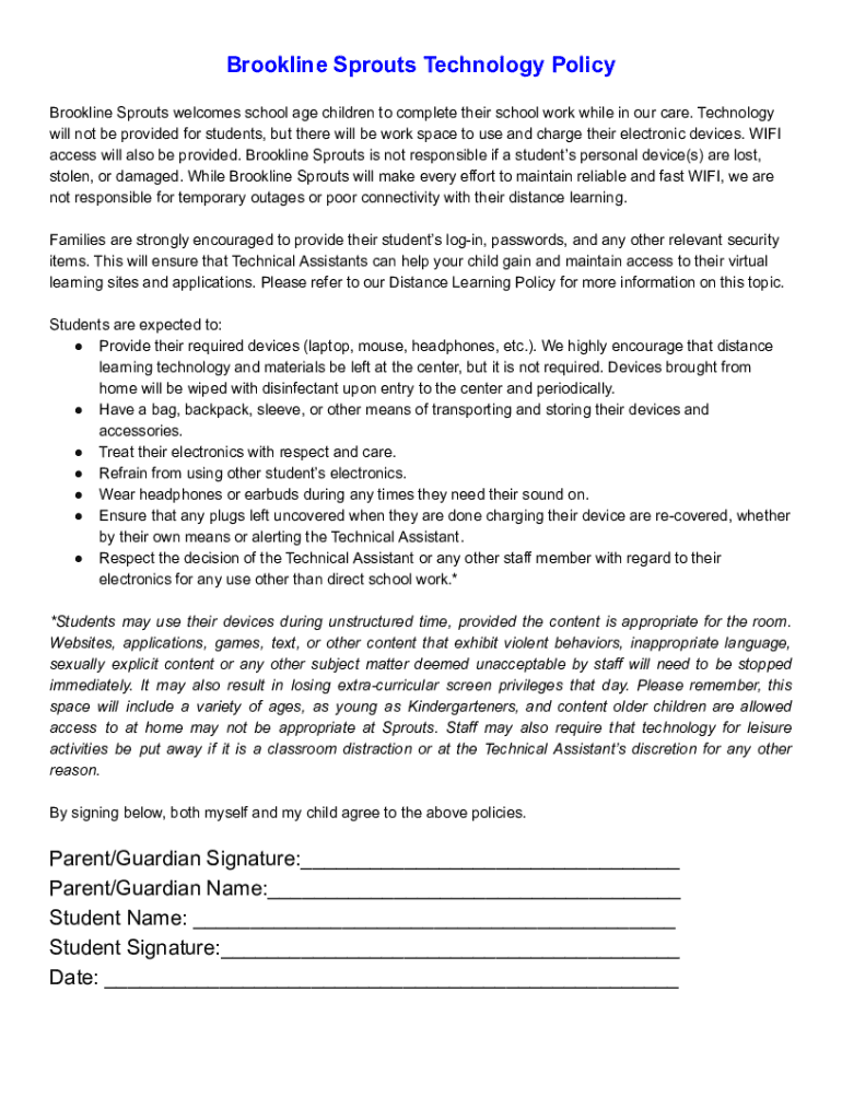 Brookline Sprouts Technology Policy Brookline Sprouts welcomes school age children to complete their school work while in our care. Technology will not be provided for students, but there will be