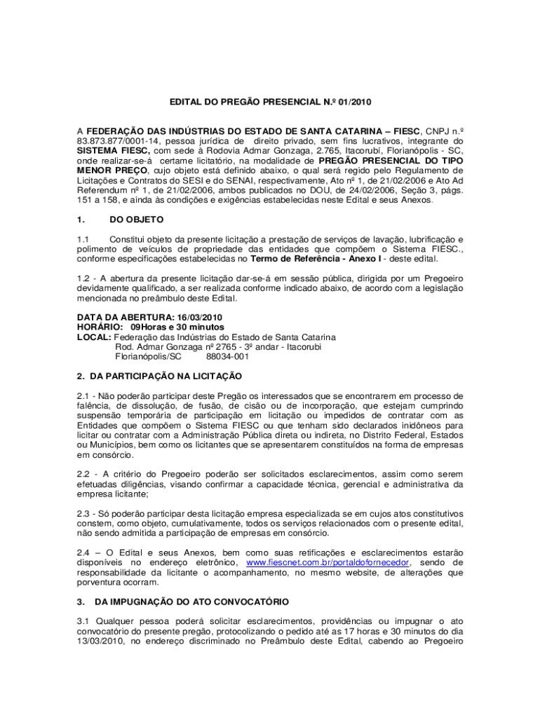 EDITAL DO PREGO PRESENCIAL N. 01/2010 A FEDERAO DAS INDSTRIAS DO ESTADO DE SANTA CATARINA FIESC, CNPJ n. 83.873.877/000114, pessoa jurdica de direito privado, sem fins lucrativos, integrante do SISTEMA