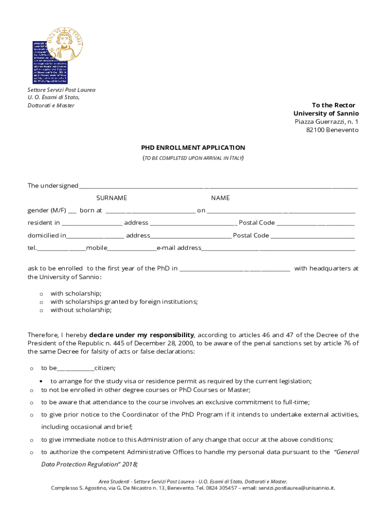 Settore Servizi Post Laurea U. O. Esami di Stato, Dottorati e MasterTo the Rector University of Sannio Piazza Guerrazzi, n. 1 82100 Benevento PHD ENROLLMENT APPLICATION (TO BE COMPLETED UPON ARRIVAL