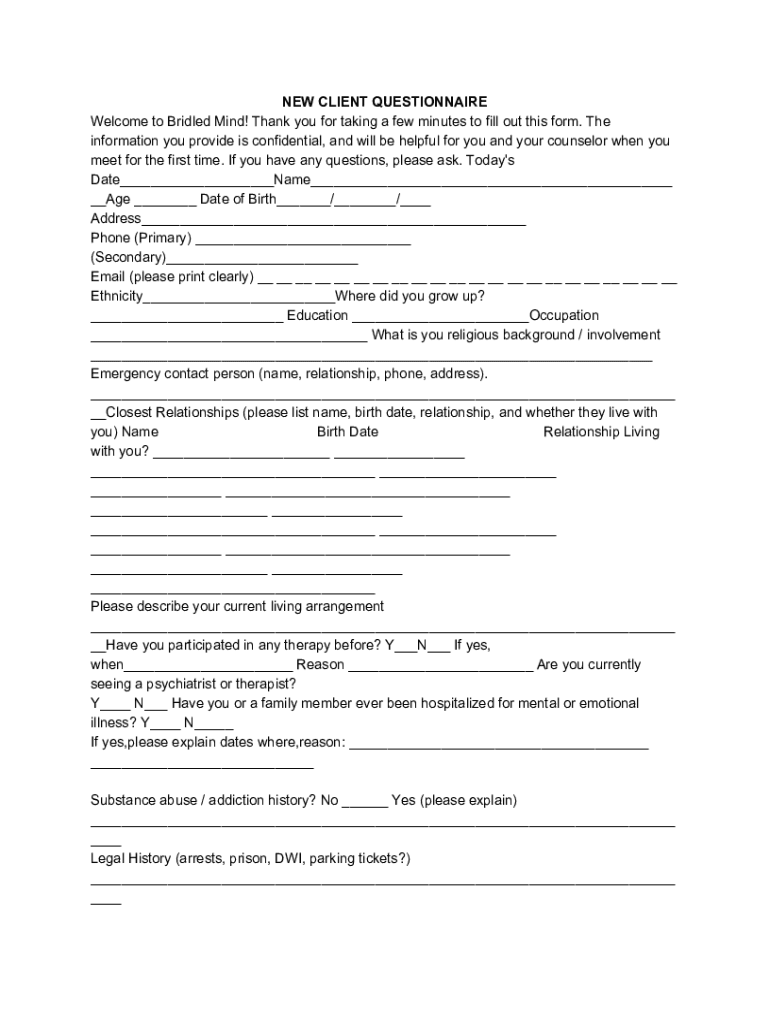 NEW CLIENT QUESTIONNAIRE Welcome to Bridled Mind! Thank you for taking a few minutes to fill out this form. The information you provide is confidential, and will be helpful for you and your counselor