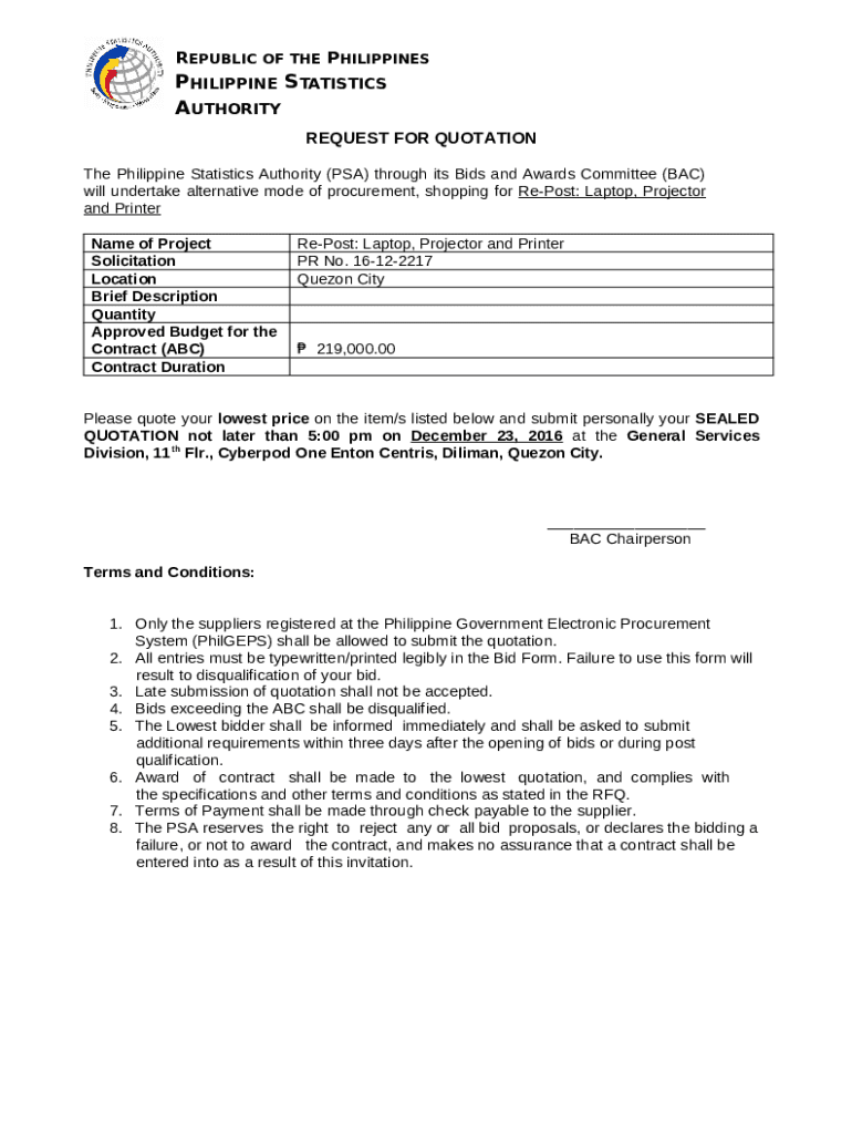 Frequently asked questions about the form The Philippine Statistics Authority (PSA) through its Bids and Awards Committee (BAC) will undertake alternative mode of procurement, shopping for Re-Post: Laptop, Projector and Printer