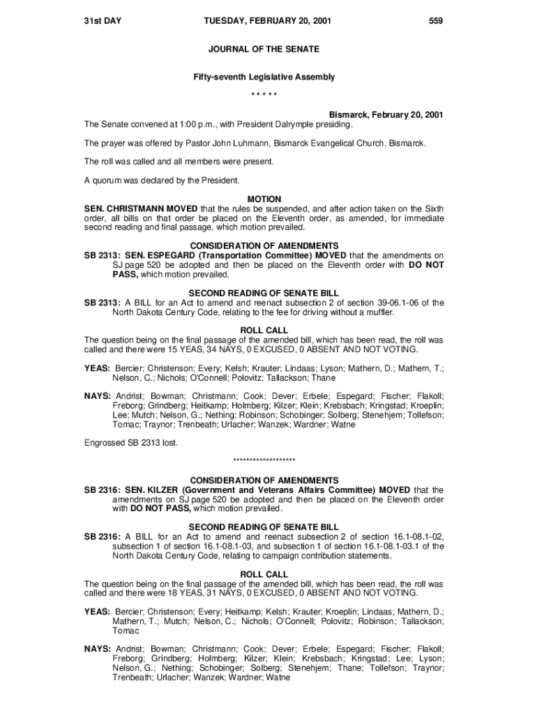 31st DAYTUESDAY, FEBRUARY 20, 2001559JOURNAL OF THE SENATE Fiftyseventh Legislative Assembly ***** Bismarck, February 20, 2001 The Senate convened at 1:00 p.m., with President Dalrymple presiding.