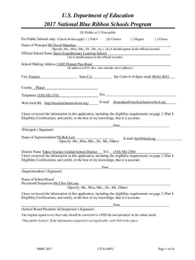 U.S. Department of Education 2017 National Blue Ribbon Schools Program [X] Public or [ ] NonpublicFor Public Schools only: (Check all that apply) [ ] Title I[X] Charter[ ] Magnet[ ] ChoiceName of