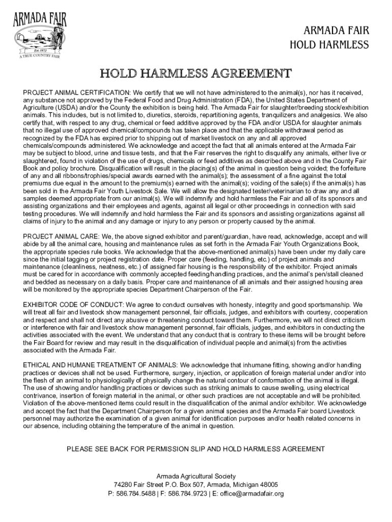 ARMADA FAIR HOLD HARMLESS HOLD HARMLESS AGREEMENT PROJECT ANIMAL CERTIFICATION: We certify that we will not have administered to the animal(s), nor has it received, any substance not approved by the