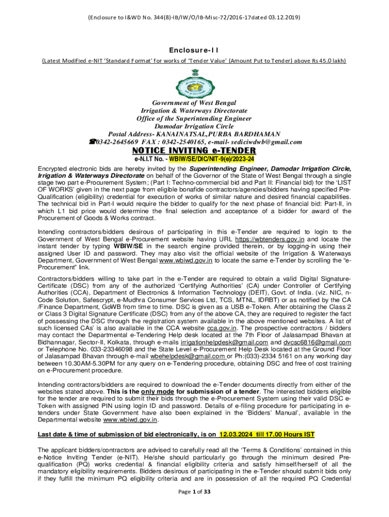 (Enclosure to I&WD No. 344(8)IB/IW/O/IBMisc72/201617dated 03.12.2019)EnclosureII (Latest Modified eNIT Standard Format for works of Tender Value (Amount Put to Tender) above Rs 45.0 lakh)Government