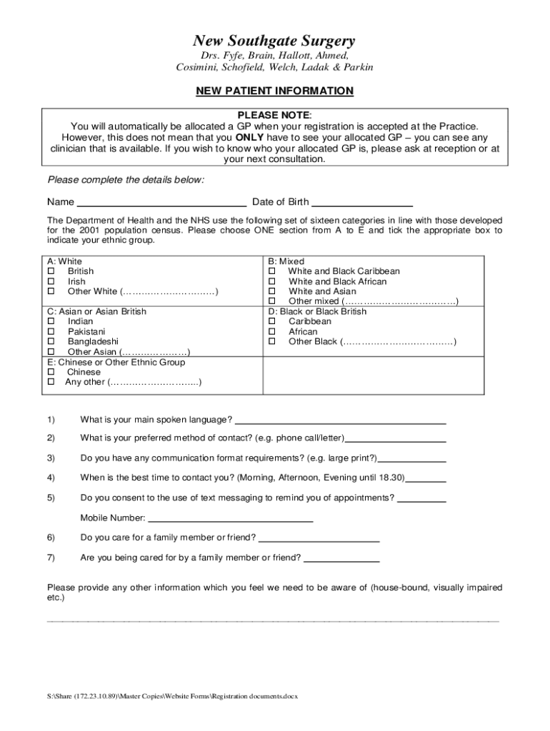 New Southgate Surgery Drs. Fyfe, Brain, Hallott, Ahmed, Cosimini, Schofield, Welch, Ladak & Parkin NEW PATIENT INFORMATION PLEASE NOTE: You will automatically be allocated a GP when your registration