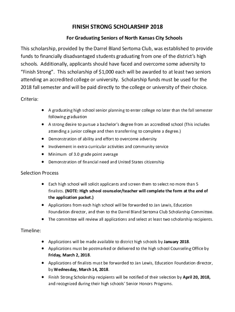 FINISH STRONG SCHOLARSHIP 2018 For Graduating Seniors of North Kansas City Schools This scholarship, provided by the Darrel Bland Sertoma Club, was established to provide funds to financially disadvantaged