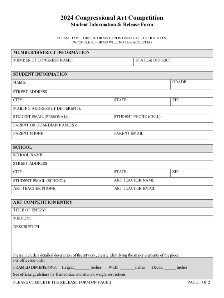 2024 Congressional Art Competition Student Information & Release Form PLEASE TYPE. THIS INFORMATION IS USED FOR CERTIFICATES. INCOMPLETE FORMS WILL NOT BE ACCEPTED.MEMBER/DISTRICT INFORMATION MEMBER
