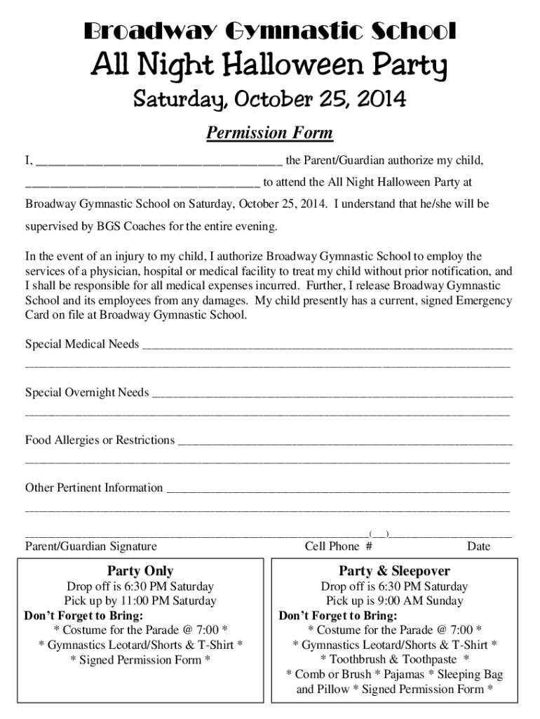 Broadway Gymnastic SchoolAll Night Halloween Party Saturday, October 25, 2014 Permission FormI, ___ the Parent/Guardian authorize my child, ___ to attend the All Night Halloween Party at Broadway