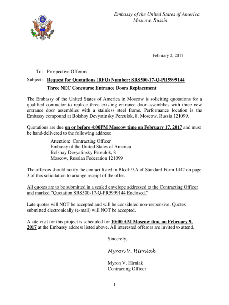 Embassy of the United States of America Moscow, RussiaFebruary 2, 2017To: Prospective Offerors Subject: Request for Quotations (RFQ) Number: SRS50017QPR5999144 Three NEC Concourse Entrance Doors Replacement