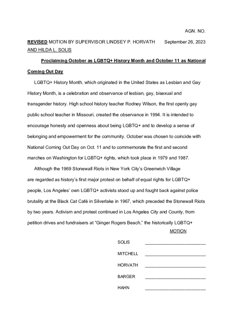 AGN. NO. REVISED MOTION BY SUPERVISOR LINDSEY P. HORVATHSeptember 26, 2023AND HILDA L. SOLIS Proclaiming October as LGBTQ+ History Month and October 11 as National Coming Out Day LGBTQ+ History Month,