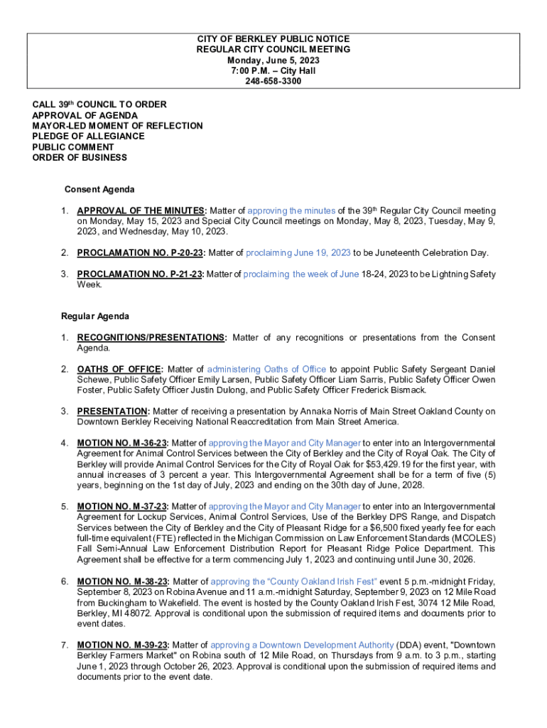 CITY OF BERKLEY PUBLIC NOTICE REGULAR CITY COUNCIL MEETING Monday, June 5, 2023 7:00 P.M. City Hall 2486583300 CALL 39th COUNCIL TO ORDER APPROVAL OF AGENDA MAYORLED MOMENT OF REFLECTION PLEDGE OF