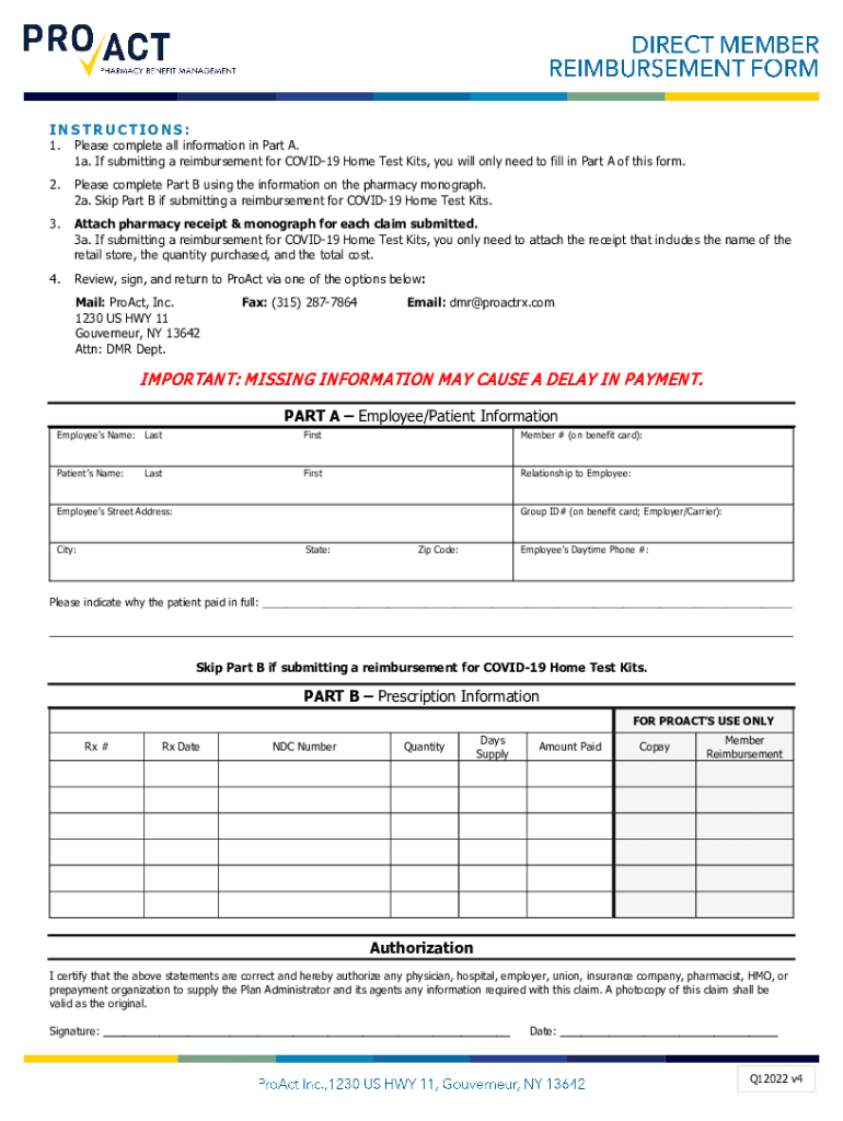 INSTRUCTIONS: 1.Please complete all information in Part A. 1a. If submitting a reimbursement for COVID19 Home Test Kits, you will only need to fill in Part A of this form.2.Please complete Part B