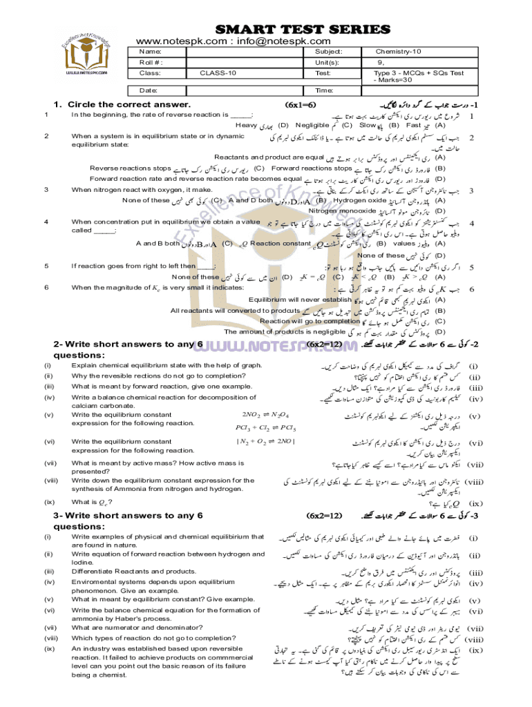 This document is a test series for Class 10 Chemistry, focused on multiple choice questions (MCQs) and short answer questions (SQs) related to chemical equilibrium.