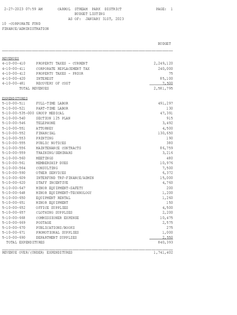 2272023 07:59 AMCARROLSTREAM PARK DISTRICT BUDGET LISTING AS OF: JANUARY 31ST, 2023PAGE:110 CORPORATE FUND FINANCE/ADMINISTRATIONBUDGET ___ REVENUES 41000410 PROPERTY TAXES CURRENT 41000411 CORPORATE