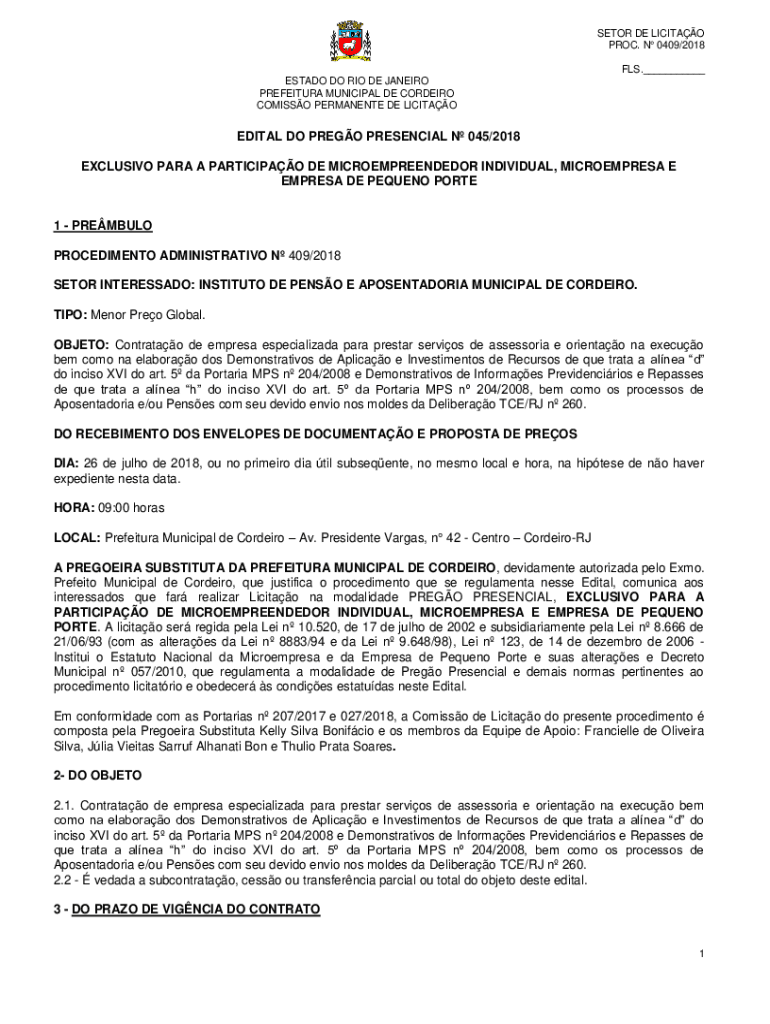 SETOR DE LICITAO PROC. N 0409/2018 FLS.___ ESTADO DO RIO DE JANEIRO PREFEITURA MUNICIPAL DE CORDEIRO COMISSO PERMANENTE DE LICITAOEDITAL DO PREGO PRESENCIAL N 045/2018 EXCLUSIVO PARA A PARTICIPAO