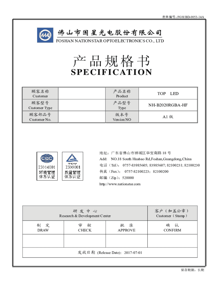 FGH/BD005314A FOSHAN NATIONSTAR OPTOELECTRONICS CO., LTD S P E C I F I C AT I O N CustomerProductCustomer TypeTypeCustomer No.Version NOTOP LED NHB2020RGBAHF A1 18 Add:NO.18 South Huabao Rd,Foshan,Guangdong,ChinaTel