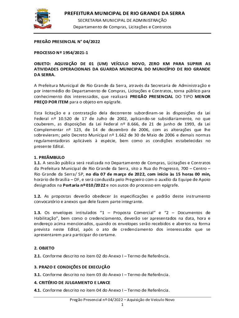 PREFEITURA MUNICIPAL DE RIO GRANDE DA SERRA SECRETARIA MUNICIPAL DE ADMINISTRAO Departamento de Compras, Licitaes e Contratos PREGO PRESENCIAL N 04/2022 PROCESSO N 1954/20211 OBJETO: AQUISIO DE 01