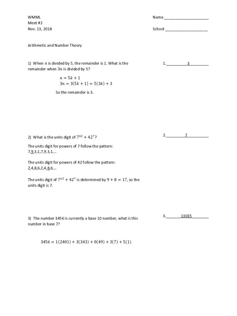 WMML Meet#2 Nov.13,2018 ArithmeticandNumberTheoryName___School___1)Whenisdividedby5,theremainderis1.Whatisthe remainderwhen3isdividedby5?1.___3___ 5 1 3 3 5 1 5 3 3Sotheremainderis3.2)Whatistheunitsdigitof72