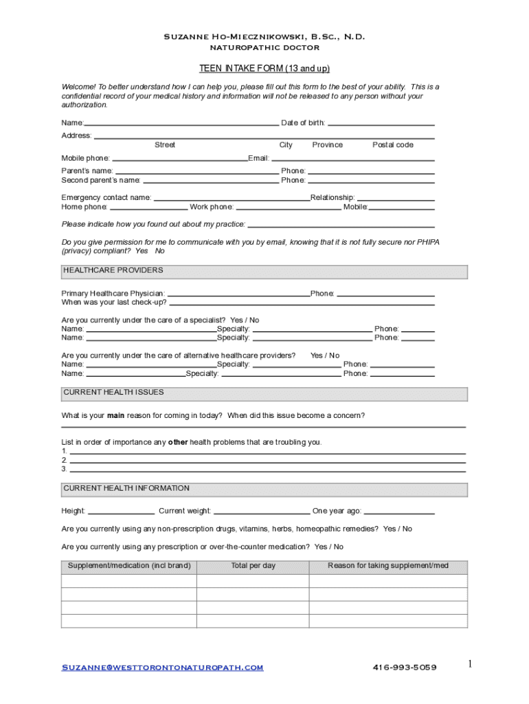 TEEN INTAKE FORM (13 and up) Welcome! To better understand how I can help you, please fill out this form to the best of your ability. This is a confidential record of your medical history and information