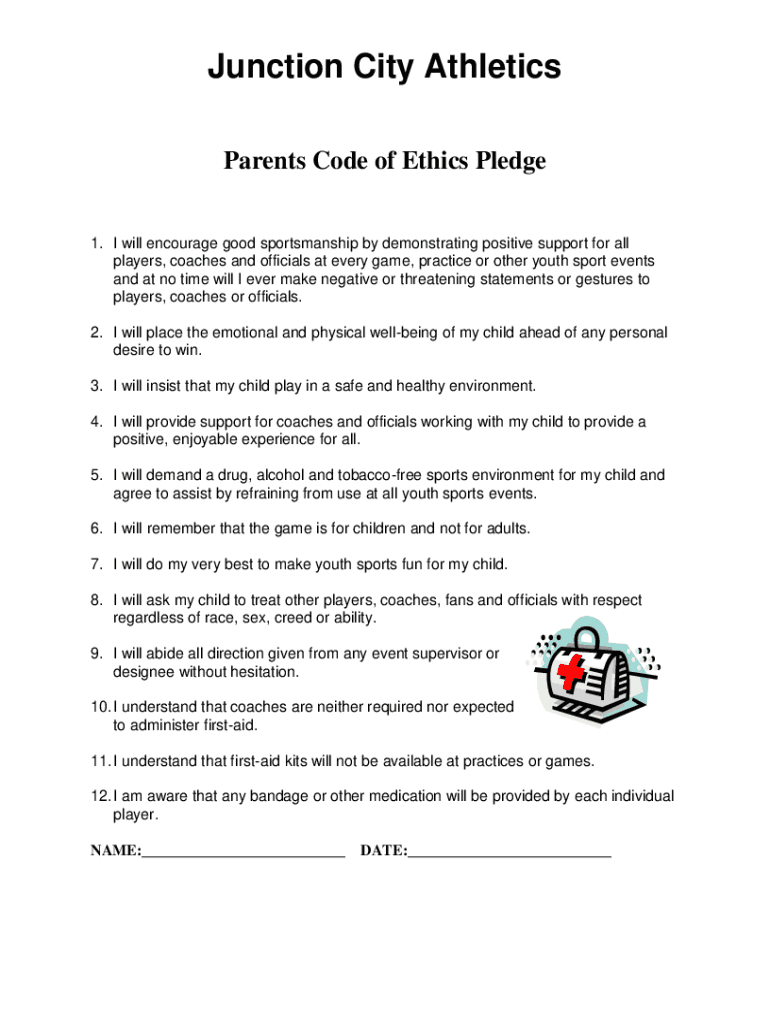 Junction City Athletics Parents Code of Ethics Pledge 1. I will encourage good sportsmanship by demonstrating positive support for all players, coaches and officials at every game, practice or other