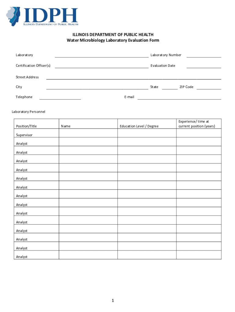 ILLINOIS DEPARTMENT OF PUBLIC HEALTH Water Microbiology Laboratory Evaluation Form LaboratoryLaboratory NumberCertification Officer(s)Evaluation DateStreet Address CityStateTelephoneZIP CodeEmailLaboratory